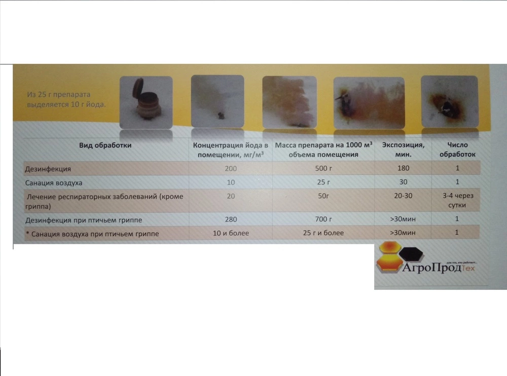 Дезинфекцию объектов животноводства и птицеводства проводят в отсутствии животных и птиц при температуре в помещении не ниже 15°С и относительной влажности не ниже 60%. Перед дезинфекцией помещение герметизируют: закрывают окна, двери, вытяжные люки, выключают вентиляцию. При проведении дезинфекции расчетное количество таблеток препарата размещают в нескольких местах на поверхности пола, на несгораемых подставках (кирпич, бетон и т.п.) из расчета 3-10 таблеток в одном месте, размещенных вертикально одна над другой, и поджигают с помощью бытовой спички. Время сгорания одной таблетки составляет 9-10 секунд, а 10 таблеток – 25-30 секунд. При сгорании образуются пары йода фиолетового цвета, равномерное распределение которых по объему помещения происходит за счет диффузии. Экспозиция дезинфекции составляет 3 часа. Санацию воздуха и лечение бронхо-легочных заболеваний проводят в присутствии животных и птицы.